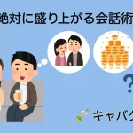 2. キャバクラで盛り上がる会話術を紹介するキャバクラナビのアイキャッチ。シャンパンアイコンと笑顔のキャバ嬢、店外デートを想像する男性、シャンパンタワーをイメージした楽しい雰囲気。